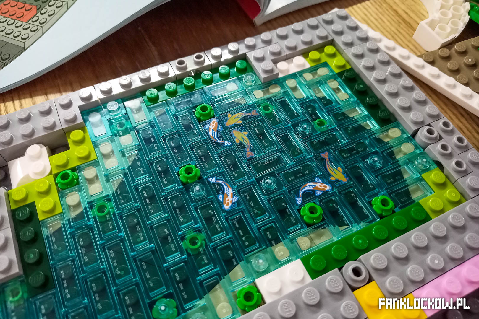 - Po pierwsze – spora część budowy „większej połowy” zestawu to dość żmudne wykładanie tafli wody. Jest to czynność nudna i powtarzalna, a do tego wymagająca pewnego skupienia, bowiem przezroczystość płytek (pomijając kilka z karpiami koi) nie przyspiesza procesu.