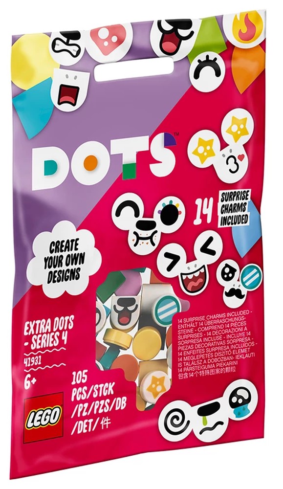 W przypadku pakietu 41931 Extra DOTS wśród 105 „kropek” otrzymamy 14 „niespodzianych” charmsów, będących minami (takimi na twarzy, a nie przeciwpiechotnymi).