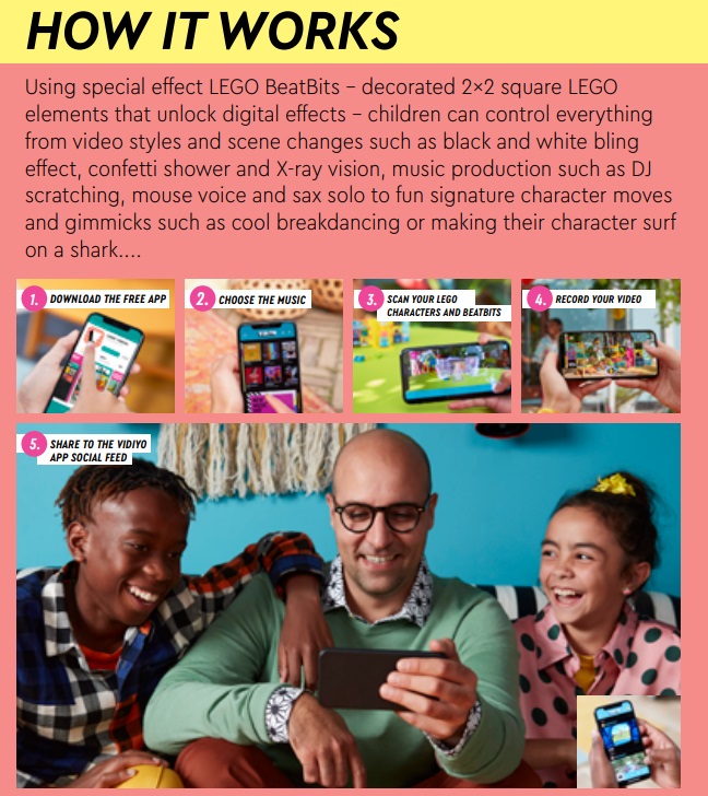 - Aby to wszystko działało, trzeba będzie za pomocą aplikacji przeskanować odpowiednią figurkę w otoczeniu tzw. BeatBits. BeatBits to tilesy 2×2 z nadrukowanymi specjalnymi wzorami, wyłapywanymi przez aplikację. Zeskanowanie odpowiedniego wzoru umożliwi „odpalenie” w aplikacji odpowiedniego efektu – wizualnego, muzycznego bądź ruchowego, a korzystające z apki dziecko będzie mogło nagrać to wszystko i udostępnić na moderowanej platformie VIDIYO™.