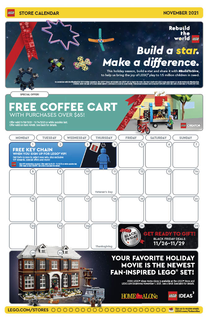 Jak widać, w kalendarzu ujawnione jest tylko jedno GwP na listopad, aczkolwiek całkiem syte: za dowolne zakupy na kwotę 65 USD lub wyżej (w Polsce pewnie będzie to ok. 260 zł), dokonane w dniach 8-14.11.2021, otrzymamy zestaw 40488 Wózek kawowy. Secik jest przyjemny, ma dwie minifigurki i idealnie wpasuje się w każdą makietę miasta.